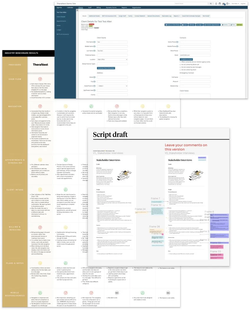 Benchmark Analysis: To identify opportunities for differentiation, TheraNest was analyzed against six competitor platforms. I and the senior designer on the team executed this work.