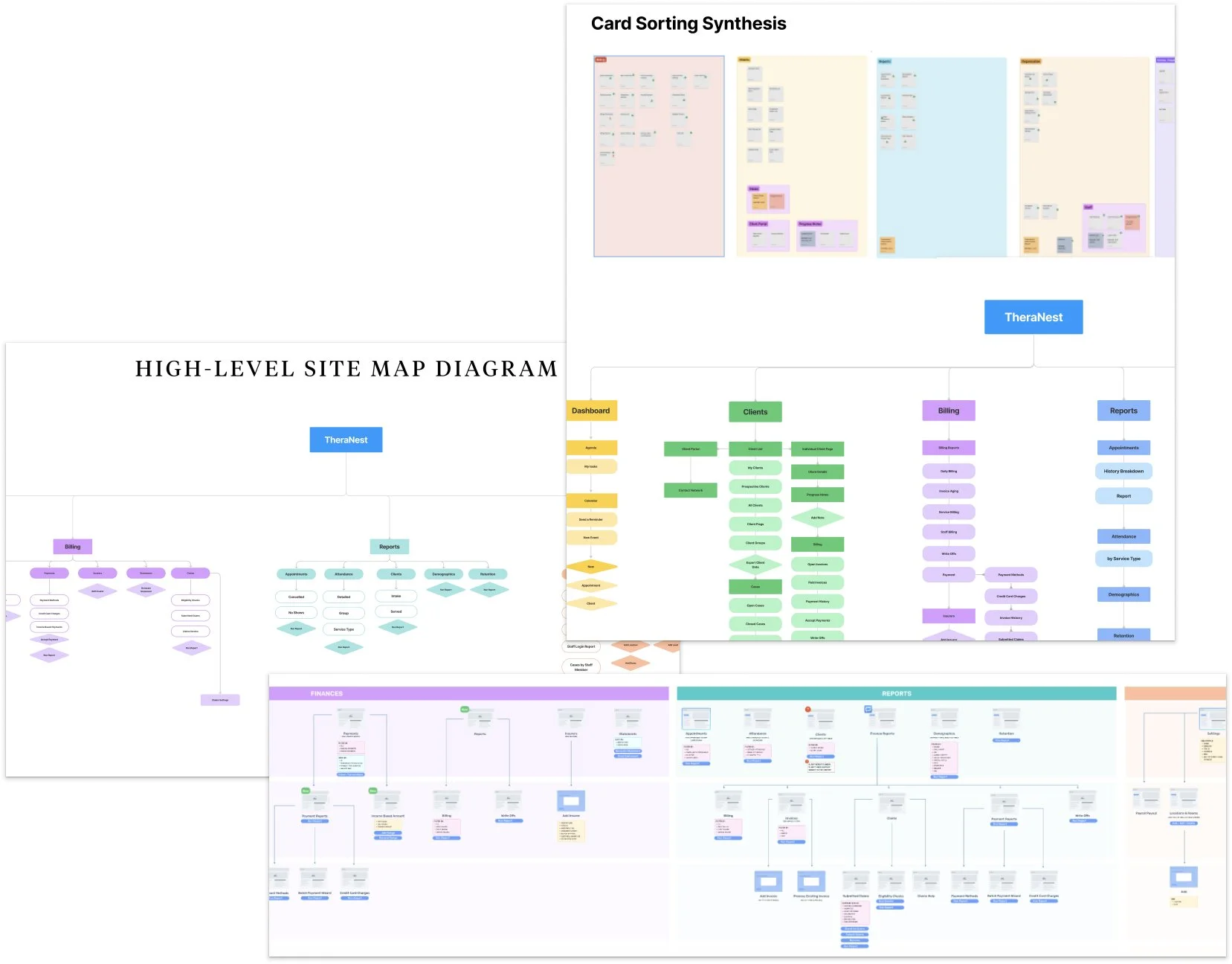 Diagrams: I created site map diagrams and began making navigation recommendations to guide the direction of TheraNest’s site schematic, address content flow gaps, and serve as a blueprint for the wireframes.