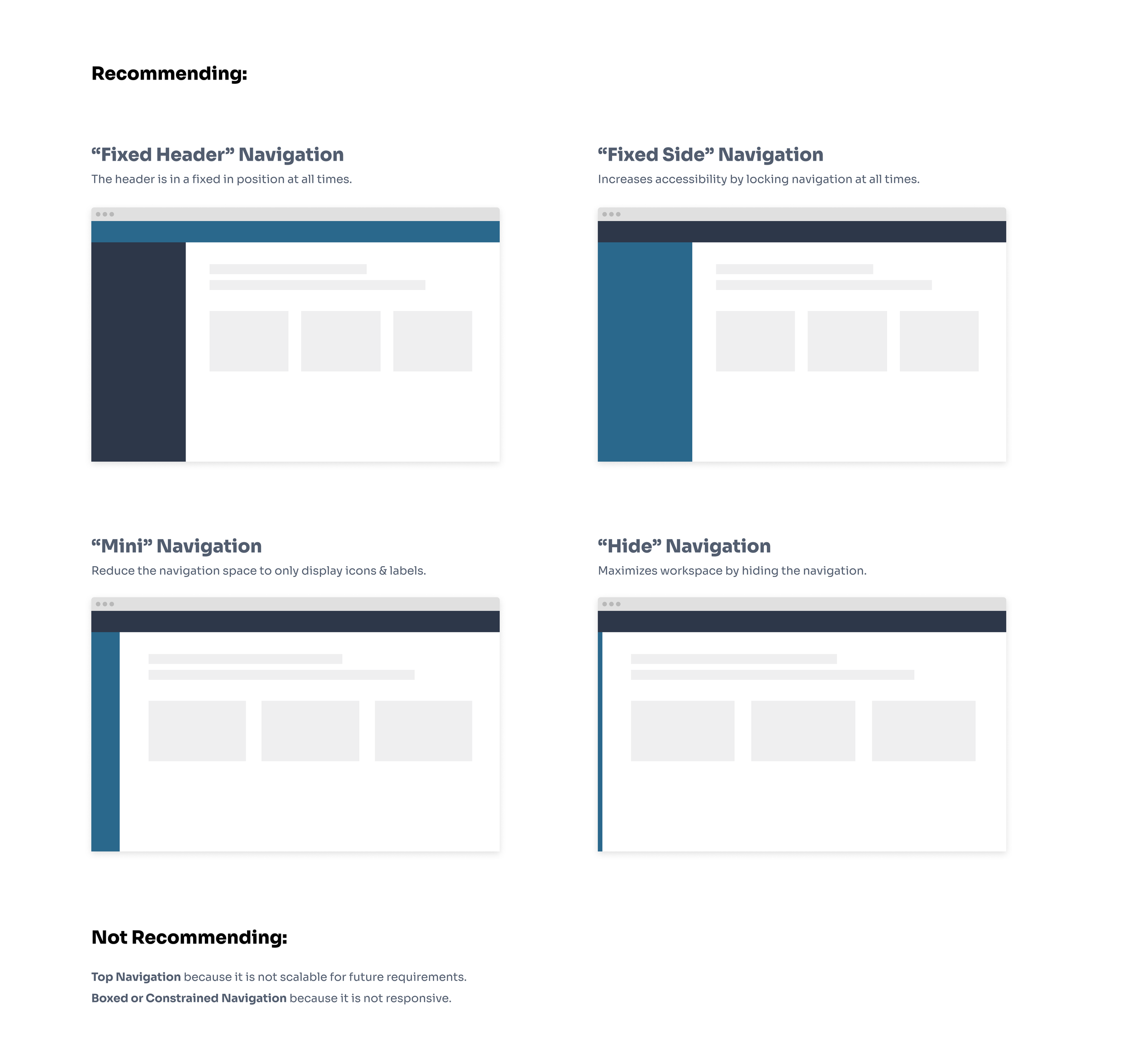 Wireframes and Prototypes: The team collaboratively created scalable wireframes representing the Global Navigation for use in early prototype testing with stakeholders and users.